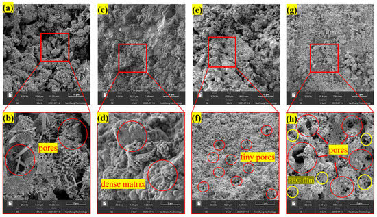 Microstructure of hydration products: (a,b)—control; (c,d)—PVA; (e,f)—PAA; (g,h)—PEG.
