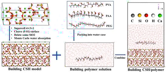 The 11 Å tobermorite crystal was used as the calculation model of CSH. The modeling process was based on the method of Wang et al. [] and the Ca/Si ratio of the CSH model was 1.67, and its unit cell parameters were a = 44.634 Å, b = 22.170 Å, c = 22.779 Å. Three polymers with a degree of polymerization of 10 were selected for simulation. At this time, the polymer chain length was about 30 Å, and a relatively flat spread distribution could be achieved on the surface of the CSH. The detailed modeling process of the CSH, polymer chain, and aqueous solution are shown in Figure 10. After the model was constructed, the system was minimized using LAMMPS-2020 to eliminate unreasonable conformations and local stresses. Subsequently, the relaxed model was simulated in the NVT ensemble at 298 K temperature with a time step of 1 fs and a total time of 3000 ps under the ClayFF force field [], which is used to obtain a balanced configuration and perform subsequent analysis.