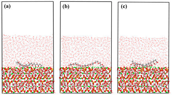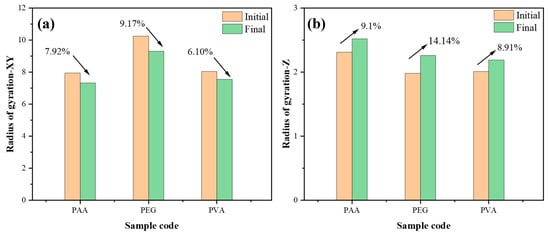 The size of the molecular chain can be characterized by the radius of gyration [,]. In view of the differences in the initial lengths of the three polymer chains, it is not relevant to directly compare the radius of gyration. In this study, the degree of conformational bending of polymer was characterized by analyzing the change rate of the radius of gyration before and after adsorption, and the results are shown in Figure 14. Among them, Figure 14a shows the XY-dimensional changes of polymers in the direction parallel to the adsorption surface, indicating that the sizes of the three polymers all decrease in this direction. Figure 14b shows that the Z-dimensional size of the polymer increases in the direction perpendicular to the adsorption surface. This phenomenon stems from the curled-up behavior of the polymer chains, which leads them to occupy more space in the vertical direction and reduce the ductility in the horizontal direction. PVA has the smallest size change, followed by PAA, and PEG has the most significant. The change rate of polymer size in the vertical direction is generally greater than that in the horizontal direction, which is due to the fact that the vertical size represents the thickness of the molecular chain. Compared with the chain length, the molecular chain thickness is smaller, so the vertical dimension is more sensitive to conformational changes.