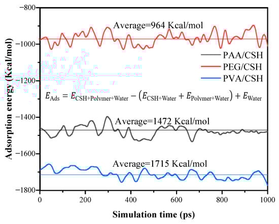 The conformations of the three polymers after adsorption with CSH are shown in Figure 11. All three polymers are close to the interface of CSH, indicating that they have good adsorption properties. Adsorption energy is a direct parameter to characterize the interfacial strength. The results of adsorption energy between polymer and CSH are shown in Figure 12. The adsorption energies of PAA, PVA, and PEG with CSH are −1472, −1715, and −964 kcal/mol, respectively. This means that PVA/CSH has the strongest adsorption, followed by PAA and PEG. The test results of the flexural strength are consistent with this, showing that the order of flexural strength enhancement effect of the three polymers is PVA > PAA > PEG. The strongest bonding and riveting effect of the PVA binder increases the interaction between the matrixes and benefits the flexural strength.