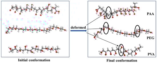 Interactions between the hydrophilic groups on the polymer surfaces lead to conformation of the chains when the polymers are adsorbed onto the CSH surfaces. The stronger the adsorption between the substrate and polymer, the weaker the interaction within the polymer chains. Therefore, the contact area between polymer and substrate can also reflect the interfacial strength []. Figure 13 shows the morphology of the three polymers before and after adsorption. It can be seen from the figure that all three polymers undergo different degrees of curling after adsorption. There is one conformation transition site for PAA and PVA, and two deformation sites for the PEG chain. Obviously, the PEG chain has the largest deformation, which further confirms that the adsorption between the PEG/CSH interface is not as strong as that for PVA and PAA.