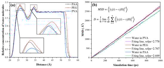 Figure 17a shows the atomic distribution of water molecules along the Z-axis of the CSH. Its distribution curve presents two main peaks. The first main peak comes from the strong hydrophilicity of the CSH surface to adsorb water molecules. The formation of the second main peak is attributed to the water molecules adsorbed by the polymer. It is worth noting that PVA has the lowest water molecule intensity at the first main peak, which indicates that its coating has an excellent isolation effect on the matrix. The results further confirm that the PVA/CSH interface has the strongest adsorption and the densest surface coverage. In contrast, the adhesion between PEG and CSH is the weakest, and its flexible molecular chain is easily deformed during adsorption, which makes the water molecules more inclined to adsorb to the surface of the CSH. The intensity of the second main peak can reflect the water absorption capacity of the polymer. The second main peak of the PEG curve is the most significant, indicating that PEG has a strong capacity for water adsorption. This is consistent with the previous RDF analysis results in that the oxygen atoms in PEG have a weak adsorption capacity for calcium ions and are more likely to form hydrogen bonds. However, the PAA surface adsorbs the least water, which indicates that PAA has the weakest water absorption capacity.