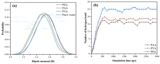 The movement behavior of water molecules during the adsorption process is shown in Figure 17b. Among them, the MSD value of water molecules in the PEG system is the smallest, while being the largest in the PAA system. The migration of water molecules is significantly affected by the adsorption characteristics of the matrix and polymer. MSD results show that PEG has the strongest restriction effect on water molecules, while PAA has the weakest effect. The hydrophilicity of the polymer directly affects its ion exchange efficiency with water molecules, thereby changing the polarity of the aqueous solution. The polarity of water molecules can be characterized by the dipole moments []. The dipole moment distribution of water molecules in different systems is shown in Figure 18a. The dipole moment of free water solution (without polymer) was 2.47 D, after the polymer was added, and the dipole moments in the PAA, PVA, and PEG systems were 2.50 D, 2.54 D, and 2.55 D, respectively. The larger the dipole moment the higher the polarity of the water molecule, and the stronger the hydrophilicity of the polymer. Therefore, the hydrophilicity of the three polymers is as follows: PEG > PVA > PAA.
