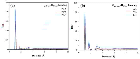 The number of hydrogen bonds is affected by the H-O interaction between the polymer and water molecules. The specific results are shown in Figure 19. It can be seen from the figure that both hydrogen atoms and oxygen atoms in the polymer molecules can form hydrogen bonds with water molecules. The intensity of Hpolymer-Owater is larger than Opolymer-Hwater, which may be due to the larger number of hydrogen atoms in the polymers, making the number of hydrogen bonds formed as hydrogen donor being dominant. However, whether as hydrogen donors or acceptors, the number of hydrogen bonds formed by the three polymers follows the order PEG > PVA > PAA. The results of this part further verify the number of hydrogen bonds in Figure 18b, indicating that PEG has the strongest interaction with water molecules, and its interface is more likely to form hydrogen bonds.