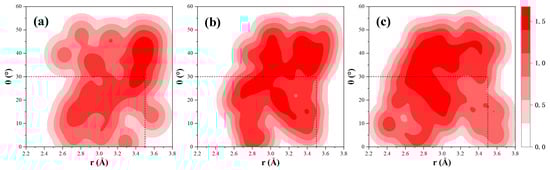 Figure 20 shows the bond length and bond angle distribution of hydrogen bonds for the three polymer–water systems. It can be seen that the hydrogen bond length of the PAA and PVA systems is mainly distributed in the range of 3.0–3.4 Å, while hydrogen bonds formed by PEG and water are more widely distributed in the range of 2.6–3.0 Å. Shorter bond lengths indicate stronger atomic interactions and higher hydrogen bond stability in PEG systems [], which may help maintain the durability of polymer reinforcement.