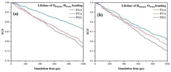The stability of hydrogen bonds can also be characterized by the time correlation function (TCF) []. Figure 21a,b show the TCF of hydrogen bonds formed by oxygen atoms in polymers and hydrogen atoms in water atoms, hydrogen in polymers, and oxygen in water, respectively. As shown in the figure, the TCF decreases with the simulation time, which indicates that the hydrogen bond will break due to the atomic thermal motion. In comparison, the hydrogen bonds formed by polymers as oxygen donors with water molecules have higher stability, which is attributed to the stronger polarity of oxygen atoms and their stronger interaction with hydrogen atoms. Among the three polymers, the stability of the hydrogen bond TCF follows the order of PEG > PVA > PAA. This shows that PEG has the best hydrophilic properties and can stably bind water molecules on its surface for a long time, thereby effectively improving the corrosion resistance of cement-based materials.