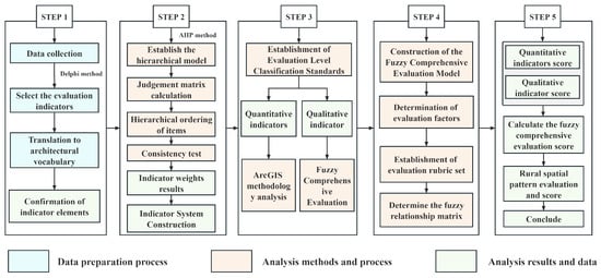 At present, common rural spatial pattern evaluation methods contain expert analysis, principal component analysis, gray correlation analysis, hierarchical analysis, and the fuzzy comprehensive evaluation method. Traditionally, face-to-face interviews and questionnaires are mainly used, and Likert scales are applied for quantitative analysis. However, this approach is subjective and time-consuming, resulting in a diversity of findings. Hierarchical analysis (Analytic Hierarchy Process (AHP)) is a decision-making method that combines quantitative analysis and qualitative analysis through the application of mathematical methods, and rationally allocates the weights of each factor through group decision-making by experts []. However, the results depend largely on the feng shui experience of the experts, and it is difficult to adapt to the analysis of complex problems []. Mathematical fuzzy comprehensive evaluation (FCE) is based on the fuzzy mathematical degree of affiliation, combined with the weighted average method to transform the qualitative evaluation into a comprehensive quantitative evaluation method. The evaluation method has the advantages of high accuracy and reliability []. However, the method is more subjective in constructing the affiliation function and requires higher data support []. With the continuous deepening of research, the geographic information system (GIS), as a powerful spatial data analysis tool, gradually shows its unique advantages in the evaluation of rural spatial patterns []. For example, some scholars have used ArcGIS spatial analysis methods to study the spatial pattern of French railroads in historical periods [] or to combine multi-scale geographically weighted regression models to analyze the focus and spatial heterogeneity of rural spatial distribution elements []. Wang et al. used GIS to analyze the characteristics of traditional village geographic patterns and morphological indicators []. These studies illustrate the superiority of ArcGIS in rural spatial planning analysis.