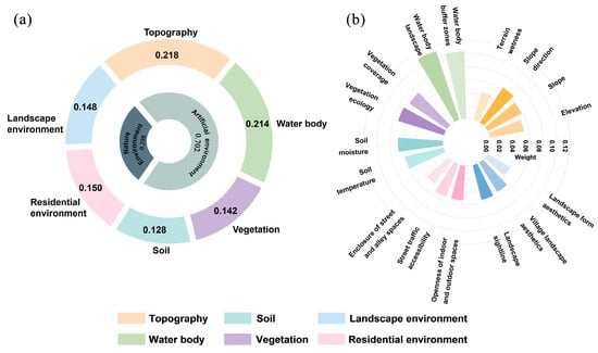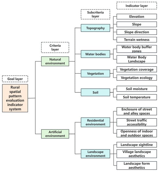 In this study, traditional Chinese geomantic theory is used as a basis to construct a rural spatial pattern evaluation model grounded in Chinese geomancy. Two primary criterion layers, the natural environment and the artificial environment, which are further subdivided into six subcriterion layers, namely, topography, water bodies, vegetation, soil, the residential environment, and the landscape environment, are established. A total of 16 indicators are derived: elevation, slope, slope direction, terrain wetness, water body buffer zones, the water body landscape, vegetation coverage, vegetation ecology, soil moisture, soil temperature, enclosure of street and alley spaces, street traffic accessibility, the openness of indoor and outdoor spaces, landscape sightlines, village landscape aesthetics, and landscape form aesthetics.