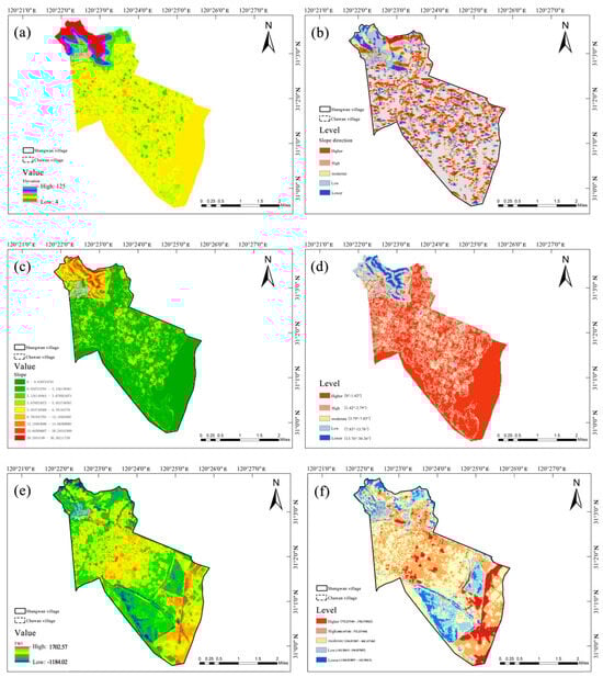 Considering the different characteristics of the indicators, the indicators in the evaluation model were categorized and evaluated. To ensure the scientific nature of the evaluation, the 16 indicators screened in Section 2.3.1 were divided into quantitative and qualitative indicators. The results for the indicators of elevation, slope, slope direction, terrain wetness, water body buffer zones, vegetation coverage, vegetation ecology, soil moisture, and soil temperature were quantitatively analyzed with ArcGIS 10.6 software (Table 2). Indicators of the water body landscape, enclosure of street and alley spaces, street traffic accessibility, the openness of indoor and outdoor spaces, landscape sightlines, village landscape aesthetics, and landscape form aesthetics are subjective. Therefore, a qualitative analysis was performed with the FCE method. In the end, nine quantitative and seven qualitative indicators were selected. Quantitative indicators were calculated via ArcGIS tools via reclassification and overlay analysis. The qualitative indicators were obtained via fuzzy integration (Table 3).