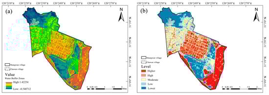 Water body buffer zones index analysis results: (a) water body buffer results; (b) results of water body buffer evaluation.