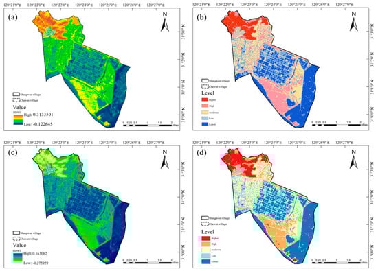 Results of the vegetation indicator analysis: (a) results of the vegetation coverage index; (b) vegetation coverage index evaluation results; (c) results of the vegetation ecological index; and (d) results of the vegetation ecological index evaluation.
