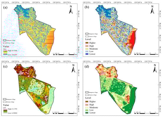The soil temperature index is analyzed on the basis of land surface temperature (LST). The results reveal that the highest value of the soil temperature index in Shuangwan administrative village is 10.572, and the lowest value is 6.589. The soil temperature in the residential areas of Chawan village ranges from 10.572 to 13.179, with the highest temperatures observed in highly populated areas. This is due to the high density of residential buildings in these areas. In addition, 75% of the area in Chawan village has soil temperatures ranging from 9.553 to 10.572 (Figure 13 and Figure 14). Therefore, the final evaluation rating is low, with a score of 2 (Table 7).