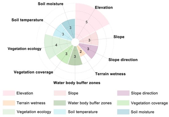 On the basis of the AHP-GIS-FCE model, objective quantitative values were assigned to the indicators of elevation, slope, slope direction, terrain wetness, water body buffer zones, vegetation coverage, vegetation ecology, soil moisture, and soil temperature. Moreover, other indicators were classified as subjective qualitative indicators. Moreover, other indicators were classified as subjective qualitative indicators. The membership degree matrix of each indicator was multiplied by the corresponding indicator weight on the basis of the survey results from 40 experts in the fields of geology, landscape architecture, urban planning, rural planning, and design, along with the objective quantitative evaluation results derived from the ArcGIS and ENVI analyses (Figure 15 and Table 8). The final fuzzy comprehensive evaluation values were obtained.