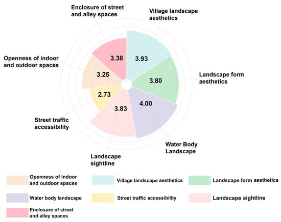 For the natural environment criteria, the elevation indicator (5) has the highest evaluation score, whereas the slope, terrain wetness, and soil moisture indicators have lower scores. For the artificial environment criteria, the water body landscape value indicator (4.00) has the highest score, whereas the street traffic accessibility value indicator (2.73) has a lower score. Overall, the subcriteria evaluation scores are as follows: landscape environment (3.85), water bodies (3.52), vegetation (3.51), topography (3.27), residential environment (3.10), and soil (3.000). The ranking of the indicator layer evaluation scores is as follows: elevation (5.0), water body landscape (4.00), vegetation ecology (4.00), village landscape aesthetics (3.93), landscape sightline (3.83), landscape form aesthetics (3.80), enclosure of street and alley spaces (3.38), openness of indoor and outdoor spaces (3.25), water body buffer zones (3.00), vegetation coverage (3.00), soil moisture (3.00), soil temperature (3.00), street traffic accessibility (2.73), and terrain wetness (2.00). The maximum membership degree result for the village is moderate, with an evaluation score of 3.385.