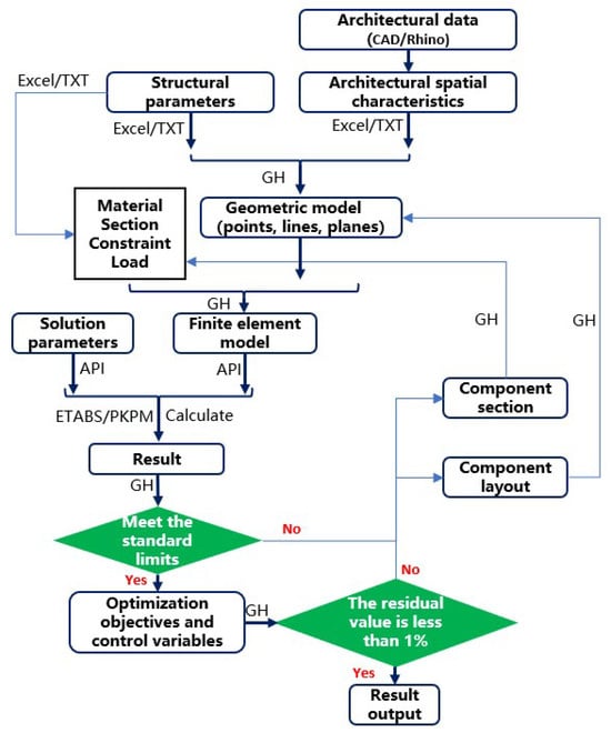 This study introduces the parametric analysis technique and conducts research and secondary development based on the Grasshopper (GH) platform. It establishes a parametric analysis method from the structural geometric model to the finite element model, and subsequently to solution calculation, result extraction, and optimization, as shown in Figure 2. First, based on the CAD floor plan or Rhino geometric model provided by the architect, key structural geometric feature data are extracted and formatted into Excel files or TXT files through preprocessing. Second, in GH, specific components are selected, and related components are developed using programming languages such as C#. The geometric information in the files is read, and a geometric model is established. Following this, the material properties, section dimensions, boundary conditions, and loads for the finite element model are defined, and the finite element model itself is created. Third, through the use of the ETABS Open API and the PKPM API, direct calls and calculations in these two software applications are executed within GH, and the calculation results are generated. The structural index limits are then assessed, including metrics such as period, displacement angle, displacement ratio, and axial compression ratio. If these limits are not met, the component sections are adjusted and recalculated until the requirements are satisfied. Finally, the component optimization principles and goals are set, results are evaluated, components are modified, and recalculations are performed repeatedly until the optimization goals are achieved. This entire parametric analysis process has been tested and verified with simple models prior to its application, and in this study, the intermediate process models and calculation results are manually reviewed to ensure their reliability.