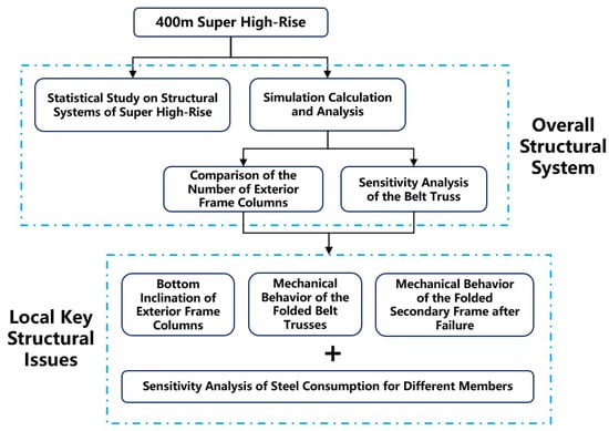 This paper divides its research into two main steps, considering the height and planar characteristics of the project. First, the overall system is examined and compared across two approaches: case data statistics and numerical simulation. Second, specific key structural issues are analyzed in detail. The overall research framework is illustrated in Figure 3.