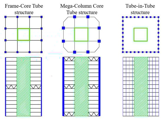 For super-high-rise structures, the commonly used lateral force-resisting systems mainly include three types, as shown in Figure 4, namely the frame–core tube structure, the mega-column and core tube structure, and the tube-in-tube (closely spaced columns exterior frame structure) structure [31,32,33,34].