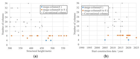 The relationship between construction start time and the type of exterior frame columns is shown in Figure 5b. It can be seen that before 2013, conventional columns were more commonly used in super-high-rise buildings. After 2013, the number of super-high-rise buildings adopting mega-column gradually increased. This might be related to architectural aesthetics, economy, as well as the development of materials and construction technologies [30].