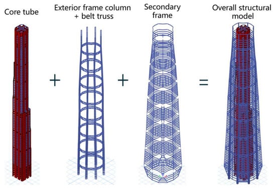 The frame–core tube structure refers to a structural system with an appropriate number of exterior frame columns and relatively uniform column spacing. Typically, there are no fewer than 12 exterior frame columns, and the spacing between columns generally does not exceed 15 m. This structural system has a large and flexible space, but its lateral stiffness is relatively low, so structural engineers usually reinforce it by adding multiple rigid strengthening layers [35]. This structural system is commonly seen in super-high-rise buildings with a height of no more than 300 m, such as the T1 tower of Sanya Joy City [36], and the D building of Hefei Greenland Center [37].