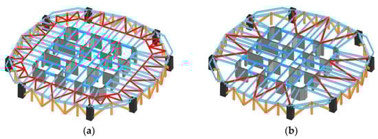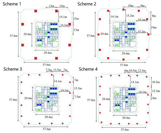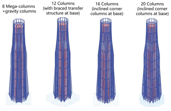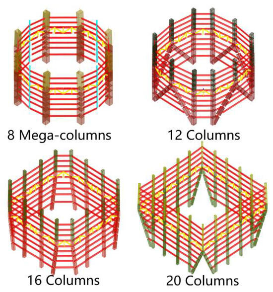 Due to the nearly square shape of the floor plan, considering the visual requirements of the building’s corners, columns should be avoided from being placed at the corners, especially those with larger cross-sections. As a result, the minimum number of columns required is 8; at the same time, the architect prefers that the spacing between columns should not be less than 10 m. Based on this, the maximum number of columns estimated is 20. Thus, four different schemes featuring varying numbers of columns have been developed, as shown in Figure 7. In each scheme, the thickness of the bottom wall is 1400 mm, the thickness of each floor slab is 120 mm, and the height of the steel beams is controlled not to exceed 1000 mm. The concrete grades for walls and columns range from C70 to C50 from bottom to top, the floor slabs use C35 concrete [43], and the steel material is G390GJ [44].