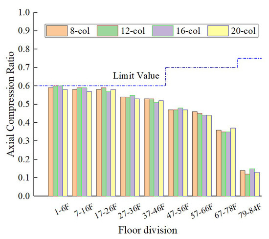 Axial compression ratio of the bottom columns in different floors of each scheme.