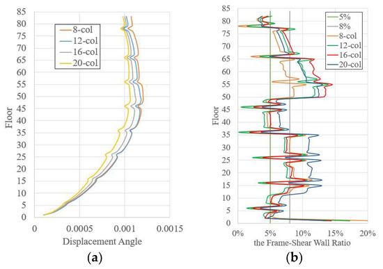 For super-high-rise structures, there should be a proper ratio between the lateral stiffness of the core tube and that of the exterior frame, in order to meet the requirements of dual seismic fortification [28]. Among the four schemes, the 20-column scheme has the largest proportion of floors where the frame–shear ratio exceeds 0.08, accounting for 54%, which meets the requirements. The proportion of such floors in the remaining schemes is less than 50%, with the 12-column scheme having the smallest proportion at 34%. According to the relevant literature [45], for structures where the structural stiffness decreases with height, appropriate relaxation can be applied. Additionally, to ensure that the exterior frame has sufficient shear resistance capacity under earthquakes, calculations are conducted separately for the exterior frame by assuming it bears 25% of the shear force at the bottom floor [46,47,48], and for the exterior frame columns using the adjustment coefficient method [49,50] to verify the shear resistance capacity of the exterior frame columns, ensuring that the shear resistance capacity of the exterior frame columns meets the requirements. Thus, the frame–shear ratio requirement can be relaxed to such that the frame–shear ratio of most floors is not less than 0.05. Under this adjusted requirement, all four schemes meet the criteria, though the 12-column scheme still has the smallest proportion of compliant floors, standing at 76%.