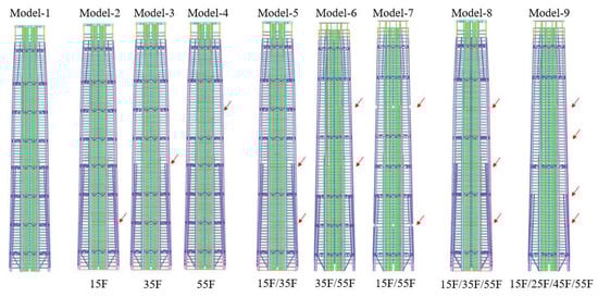 The sensitivity analysis of the belt trusses adopts the decreasing method, which starts with 8 belt trusses and gradually reduces their quantity. The comparison schemes for the sensitivity analysis of the belt trusses are shown in Figure 12. The first model is the initial 8-belt trusses model. In the other models, the arrows indicate the positions where the trusses are to be removed. The Model-2 to Model-4 have had a belt truss removed, the Model-5 to Model-7 have had two belt trusses removed, and the Model-8 and Model-9, respectively, have had three and four belt trusses removed. Moreover, it should be noted that three belt trusses cannot be removed: the first one at the 5th floor at the bottom, which is used to suspend the lower gravity columns, and the two at the top, which are, respectively, used to support the crown and serve as the transfer structure between the hotel and office areas.