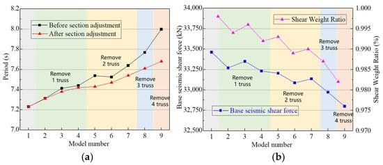 The first-order period of the super-high-rise structure is a fundamental characteristic that remains unaffected by external loads, determined by the distribution of the structure’s mass and stiffness. It has certain correlations with indicators such as the stiffness weight ratio, shear weight ratio, and the maximum displacement angle, serving as a comprehensive indicator that effectively reflects the structural characteristics [33]. For super-high-rise buildings that are up to 400 m tall, it is usually necessary to control their first-order period so that it does not become too long. This is to prevent it from exceeding the reasonable period range of the structure [33], which typically indicates insufficient structural stiffness and inadequate seismic forces. Furthermore, based on calculations of this project and previous experiences for super-high-rise structures, under the premise of reasonable buildings and structures, the adjustment of member cross-sections usually has an impact on the period within 0.2 s. Therefore, the adjustment and iteration goal for each scheme is to control the decrease in the first-order period by 0.1 s, and then the increase in steel consumption of each scheme is compared. The scheme with the smallest increase in steel consumption is the most efficient adjustment strategy.
