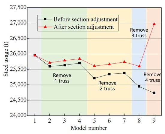 Different schemes for the arrangement and quantity of belt trusses (The arrows in the figure indicate the positions where the trusses are to be removed).