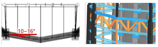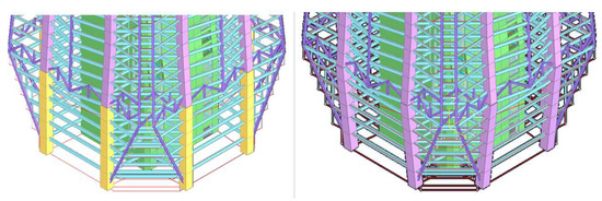 In terms of architectural effect, the influence of column spacing and column cross-section on the office view needs to be considered. In addition, to meet the spatial requirements at the entrance of the first floor lobby and the form of corner chamfering at the bottom floor, the 12-column scheme requires structural transfer of the middle columns at the bottom, while the 16-column and 20-column schemes need to adopt inclined columns or adopt structural transfer at the corners, respectively, as shown in Figure 8 and Figure 9.