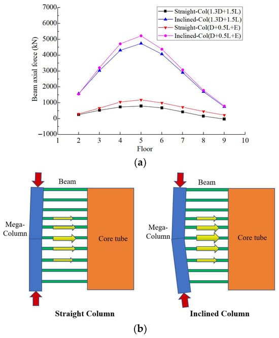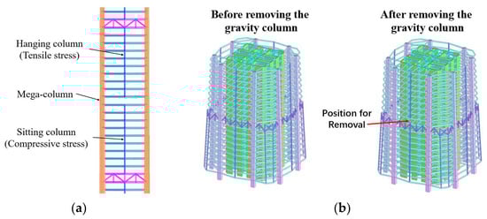 Between the mega-columns and the belt trusses of this project, a folded secondary frame is formed by gravity columns and folded beams. This secondary frame adopts a “half-sitting half-hanging” design [51], meaning that the gravity columns are either supported by or hanging from the belt trusses, providing support for the folded exterior frame beams with I-shaped cross-sections on each floor, as shown in Figure 20a. When local instability or damage occurs to the gravity columns, the span of the exterior frame beams can change from 13 m to 26 m, leading to a significant increase in mid-span vertical deformation and altering the stress state of the members. Additionally, the folded exterior frame beams will experience torsional deformation, causing the I-shaped cross-section beams to undergo torsion and weak-axis bending. Therefore, it is essential to conduct a comparative analysis of the force conditions of the exterior frame beams before and after the removal of the gravity columns to avoid continuous failure. Between every two adjacent belt trusses, the topmost and bottommost gravity columns, respectively, bear the maximum tensile force and the maximum compressive force. Failure of these columns would be the most detrimental to the secondary frame. Therefore, in this study, the bottom gravity column is selected for removal, and the removed column is located above the belt truss on the 15th floor, as shown in Figure 20b.