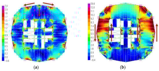 The calculation results for the overall indicators of each scheme are presented in Table 4. The indicators for the period, displacement angle, and frame–shear ratio of each scheme all meet the specified requirements. Additionally, the displacement angle levels across all schemes are relatively consistent. The cross-sectional areas of the mega-columns and walls are determined by the axial compression ratio and are not significantly influenced by the number or positioning of the belt trusses; therefore, these details are not included here.