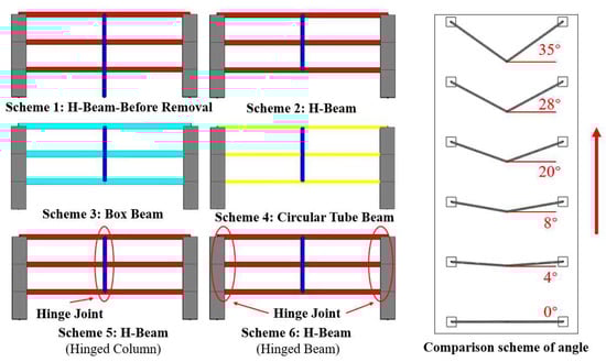 To further investigate the mechanical behavior of the folded beams in the secondary frame after the failure of the gravity column, a local simplified analytical model is established. A parametric analysis is conducted to examine different folded angles, beam section types, and constraint conditions. The folded angle is considered to be six different working conditions within the range of 0° to 35°. The beam sections considered include H-shaped, circular tube-shaped, and box-shaped sections (considering axial stiffness equivalence or flexural stiffness equivalence). In addition, based on the previous analysis, the beam end bending moment and the gravity column bending moment increase significantly after the removal of the gravity column. Therefore, a scheme with hinged ends of the beam and the column is supplemented to simulate the structural stress after the formation of plastic hinges. The comparison scheme is shown in Figure 21.