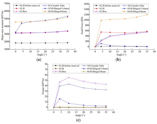 The internal forces of the folded beam with varying angles. (a) Strong-axis moment; (b) Axial force; (c) Torque.
