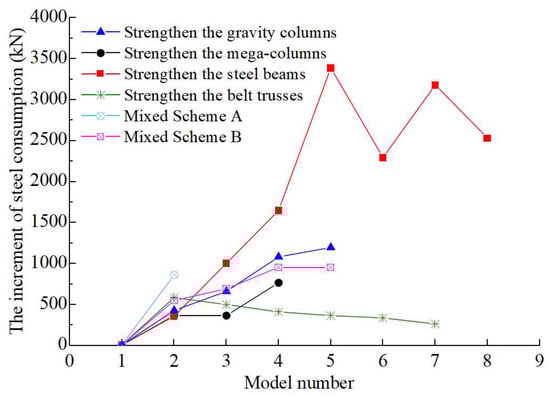 For this project, steel consumption is the main controlling factor of the structural material cost. In Section 3 of this paper, we explored how the number of mega-columns and belt trusses affects structural indicators and steel consumption from the perspective of the overall structural system. On the premise that the overall structural scheme is determined, in order to find the most efficient and steel-saving strengthening or optimization strategies at the member level, adjustments and comparative studies are, respectively, conducted on the cross-sections of mega-columns, gravity columns, frame beams, and the belt truss members.