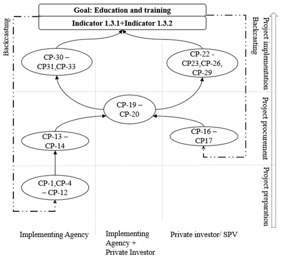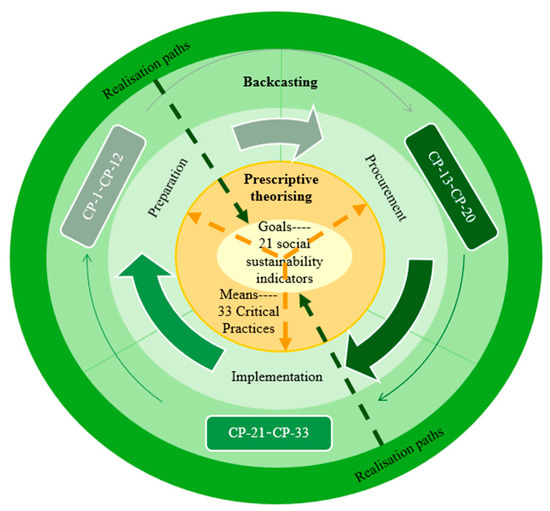Second, the backcasting method was used to analyse how the identified CPs were implemented step by step to achieve social sustainability. Backcasting entails first defining a successful end state and then working backwards to plan specific actions from the present to reach that goal. This approach helps avoid sub-optimisation by starting from a strong definition of the desired outputs [52]. It aligns closely with the prescriptive theorising process. In this study, the established social sustainability indicator framework for elderly care projects was set as the goal. The identified CPs were then linked to the various indicators according to their implementation order.