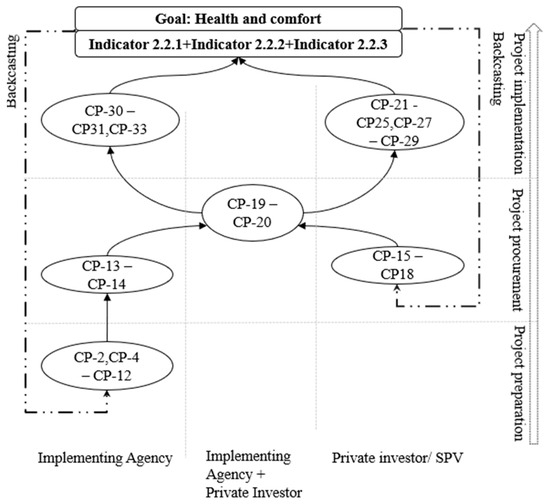 Health and comfort is one of the impacts of projects on the well-being of the elderly and their relatives, encompassing the three most important indicators—satisfied basic needs (Indicator 2.2.1), satisfied health and physical comfort (Indicator 2.2.2), and satisfied psychological comfort (Indicator 2.2.3). The result of Backcasting analysis is shown in Figure 3.