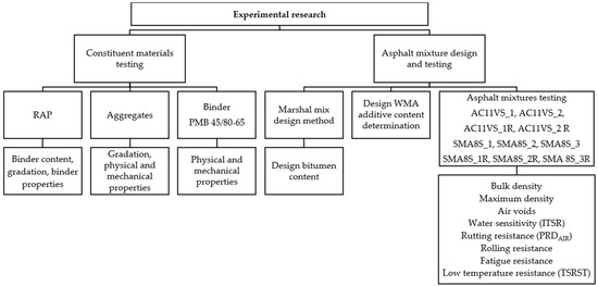 Ten asphalt mixtures with nominal aggregate size of 8 mm and 11 mm were designed: four of them were AC 11 VS (V indicates “wearing layer”, “S” indicates suitability for high-load traffic conditions) mixtures (without RAP and with RAP) and the other six were SMA 8 S (“S” indicates suitability for high-load traffic conditions) mixtures (without RAP and with RAP). The flowchart of the experimental research is given in Figure 1.