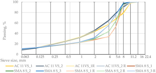 Figure 2 shows the particle size distributions for all mixtures. SMA 8 S was designed with three different coarse particle fractions, and AC 11 VS with two. Key gradation differences appeared at the 4 mm, 5.6 mm, and 8 mm sieves, which are most relevant for surface texture. Asphalt mixtures containing RAP were designed to match the gradations of those without RAP. RAP binder content was established according to EN 12697-1