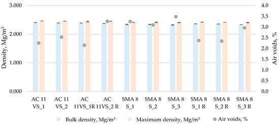 Figure 6 presents the bulk density, maximum density, and air voids content for each asphalt mixture. AC mixtures (such as AC 11 VS_1 and AC 11 VS_2) displayed the highest bulk and maximum densities (2.401–2.462 Mg/m3), a tendency also reported in previous studies, where continuous aggregate gradation combined with relatively lower binder content was found to promote dense aggregate packing and higher mixture compactibility [17]. By contrast, SMA mixtures had lower densities (2.324–2.418 Mg/m3), reflecting their gap-graded aggregate skeleton, higher binder and filler content, and addition of fibers, characteristics widely recognized in the literature as typical for SMA design [34,35]. Previous studies have shown that the gap-graded structure of SMA, while reducing overall mixture density, improves stone-on-stone contact and is known to enhance resistance to rutting.
