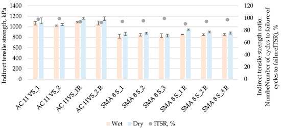 The ITSR is a crucial indicator of an asphalt mixture’s resistance to moisture-induced damage. An ITSR value of 90% is required for the wearing layer asphalt mixture to ensure satisfactory water sensitivity performance. In this study, all mixtures met or exceeded the 90% threshold. The ITSR values ranged from 90.5% (SMA 8 S_1 R) up to 99.2% (AC 11 VS_2, SMA 8 S_3), demonstrating excellent resistance to moisture damage across the board, which is consistent with previous studies reporting high water resistance in both dense-graded and SMA mixtures incorporating polymer-modified binders and performance-enhancing additives [22,35]. The lowest ITSR values, observed in SMA mixtures containing RAP, still satisfied the specification, but suggest that these mixtures may benefit from the use of anti-stripping agents or improved binder–aggregate compatibility, particularly when higher RAP contents are used. The observed results emphasize the influence of mixture composition on ITS and ITSR. Dense-graded AC mixtures, with lower binder content and optimized gradation, showed higher tensile strength and water resistance. All tested asphalt mixtures—both AC and SMA, with or without RAP—demonstrated ITSR values above the 90% criterion, confirming compliance with relevant European standards and suitability for practical application in pavement structures.