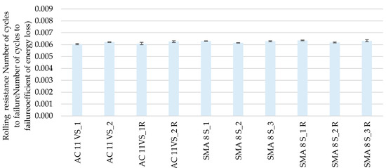 Figure 8 presents the rolling resistance values for each asphalt mixture, expressed as the coefficient of energy loss measured under laboratory conditions. Rolling resistance is a key functional property for road surfaces, as it directly affects vehicle fuel consumption and, by extension, greenhouse gas emissions and operational costs, a relationship well-documented in previous research [12]. All tested mixtures exhibited low coefficients of energy loss, generally ranging from 0.0060 to 0.0064. The lowest rolling resistance was observed in AC 11 VS_1 (0.00603) and AC 11 VS_1 R (0.00607). These results are consistent with the literature, where dense-graded asphalt concretes and well-optimized SMA mixtures are known to provide favourable rolling resistance, supporting energy-efficient transportation [12,36]. The composition of the mixtures—including aggregate gradation, air void content, binder type, and RAP percentage—does not have a significant effect on rolling resistance. Minimal differences between mixtures reflected the stabilizing effect of PMB, the optimized surface texture from gradation design, and the absence of RAP-induced surface roughness. Mixtures with denser aggregate packing and lower air voids, such as AC 11 VS_1 and AC 11VS_1R, tend to reduce energy loss due to their smoother surface texture and lower hysteresis under load. The inclusion of RAP in both AC and SMA mixtures did not lead to a significant increase in rolling resistance, suggesting that the proper selection of RAP content can preserve or even improve functional surface performance [36]. SMA mixtures, especially those with higher binder content and optimized stone-on-stone contact, demonstrated comparable rolling resistance to conventional AC, confirming that sustainable designs need not compromise surface efficiency [36]. Maintaining low rolling resistance is essential not only for reducing fuel consumption but also for minimizing emissions and contributing to the circular economy by prolonging pavement life and enhancing user comfort [12]. The results of this study confirm that both AC and SMA mixtures, even with moderate RAP content, can achieve rolling resistance values in line with international best practices, provided that mixture design is carefully controlled.