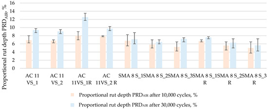 Figure 9 summarizes the resistance to rutting of all tested asphalt mixtures, measured as proportional rut depth (PRDAIR) after 10,000 and 30,000 cycles. Resistance to rutting is an essential property that indicates a pavement’s ability to withstand permanent deformation caused by repeated traffic loading. The proportional rut depths after 10,000 cycles varied from 5.0% to 8.0%, and after 30,000 cycles from 5.6% to 12.5%. RAP’s stiff binder and SMA’s stone-on-stone skeleton improved deformation resistance, particularly in SMA with RAP, while AC mixtures without RAP showed higher rut depths due to lower stiffness. In general, SMA mixtures exhibited lower rut depths compared to AC mixtures, particularly at higher loading cycles, which is consistent with the well-documented benefit of stone mastic asphalts’ stone-on-stone aggregate structure for resisting deformation [35].