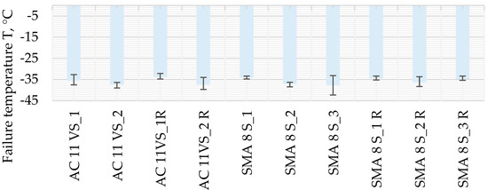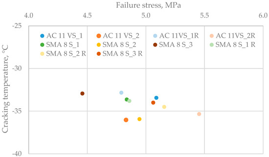 Figure 11 summarizes the relationship between failure stress and cracking temperature for the evaluated asphalt mixtures, based on TSRST results. The average failure stress ranged from 4.5 to 5.5 MPa, while the corresponding average cracking temperatures ranged from −32.9 °C to −35.9 °C. Mixtures with higher average failure stress (e.g., AC 11VS_2R: 5.5 MPa) generally exhibited lower (more negative) cracking temperatures (−35.3 °C), indicating enhanced resistance to thermal cracking. Conversely, mixtures with lower average failure stress, such as AC 11VS_1R (4.79 MPa, −32.8 °C), fractured at higher (less negative) temperatures, reflecting a reduced ability to withstand low-temperature shrinkage stress.