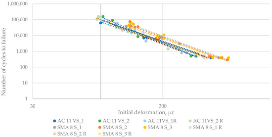 Figure 12 presents the results of resistance to fatigue for all tested asphalt mixtures, expressed as the strain amplitude (ε6, in microstrain) corresponding to one million loading cycles. Resistance to fatigue is a key mechanical property that indicates a pavement’s ability to withstand repeated traffic loading without developing structural cracks. The mixtures demonstrated a range of fatigue resistance values, with ε6 varying from 35 to 63 με. SMA mixtures, particularly SMA 8 S_3 (63 με), exhibited the highest fatigue resistance, a tendency also reported in previous studies and attributed to the beneficial effects of higher binder content and improved aggregate structure in these mixes [35]. AC mixtures, such as AC 11 VS_1 (38 με), generally showed lower fatigue strain levels, indicating a reduced ability to endure repeated flexural stresses compared to SMA designs. Higher binder content and cellulose in SMA supported superior fatigue life, but RAP’s stiff binder reduced strain capacity in certain SMA mixtures; AC mixtures were less sensitive to RAP in fatigue.