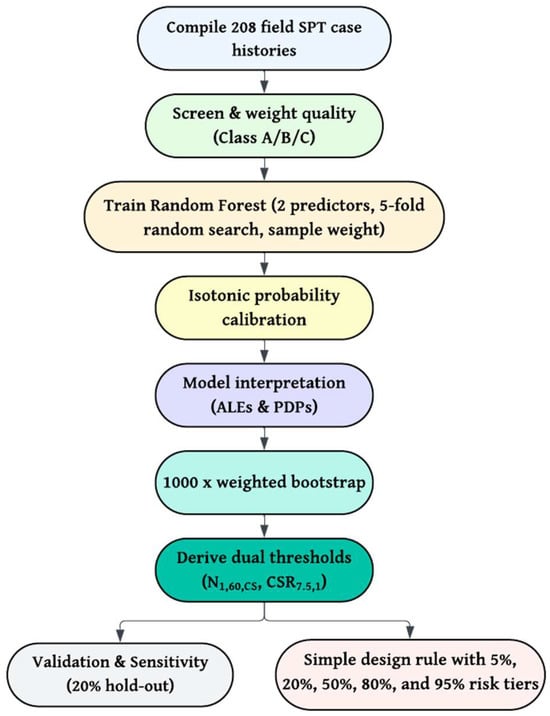The limitations discussed above motivate a new approach that blends data-driven rigor with practical simplicity. The present work addresses two key gaps. First, it calls for a dual-parameter, probability-graded liquefaction criterion that directly supports seismic foundation design and is (i) based on field data, (ii) calibrated to an actual Pliq, and (iii) simplified for use by engineers. Unlike traditional single-line charts, a probability-explicit criterion allows engineers to choose different safety levels (e.g., 5%, 20%, 50%, 80%, or 95% chance of liquefaction) and determine the corresponding SPT-CSR cutoff values. The second gap pertains to measuring model uncertainty, such as through bootstrap resampling, and accounting for varying case history qualities without adding unnecessary scatter to the final design thresholds. To do this, the work employs a case weighting scheme that emphasizes high-quality SPT data, similar to the expert judgment filters used by Moss et al. []. It uses bootstrapped CIs to ensure the thresholds are statistically reliable. Figure 1 shows the study workflow, which includes compiling the SPT database, training the RF model, calibrating probabilities, and converting the results into a straightforward design rule.