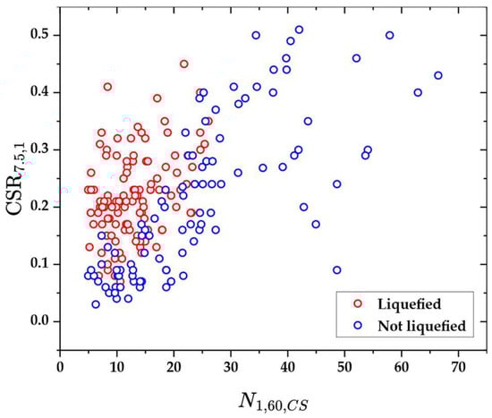 CSR7.5,1 vs. N1,60,CS scatter; red = liquefied, blue = not liquefied. Data: Cetin et al. (2018) [].