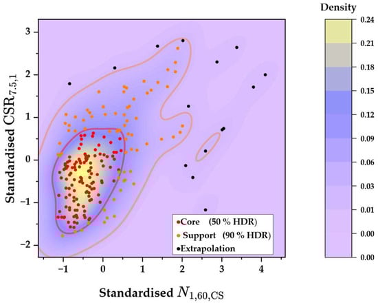 To visualize how well the 208 weighted cases populate the (N1,60,CS, CSR7.5,1) plane, a bivariate kernel density estimate [] was computed on the standardized predictors (z-scored to a mean of zero and unit variance) using the quality weights wi = (1.0, 0.70, 0.40). The smallest contours that enclose 50% and 90% of the total weighted probability mass were extracted; these define a Core zone (densest half of the weighted data, where predictions rely on strong interpolation), a Support zone (the next 40% of weighted data, still interpolative but sparser), and an Extrapolation zone (the outer 10%, where little or no data exists and predictions must be used with caution).