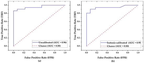 Figure 4 shows the receiver operating characteristic (ROC) curves for both models. Panel (a) presents the uncalibrated model’s ROC curve, which closely approaches the top-left corner with an AUC of 0.96, greatly surpassing the chance diagonal (AUC = 0.50). Panel (b) displays the isotonic-calibrated model’s ROC curve, which maintains high discriminative ability with an AUC of 0.95, again exceeding the baseline, confirming that calibration adjustments do not compromise overall classification performance.