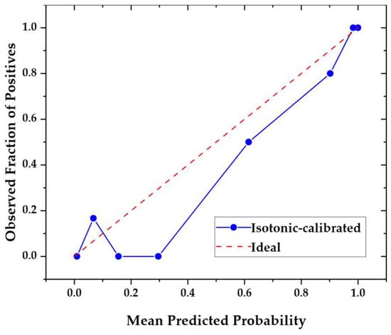 The calibration quality of the isotonic-calibrated RF model is further examined in Figure 5, which presents a reliability diagram [] plotting the observed fraction of positive outcomes against the mean predicted probability of a positive outcome. The blue line representing the isotonic-calibrated predictions demonstrates reasonable alignment with the ideal red dashed line (y = x), particularly in the mid-to-high probability ranges. However, minor deviations occur at lower probabilities. This visual assessment confirms the model’s well-calibrated probabilistic outputs, where predicted probabilities closely align with empirical frequencies, thereby enhancing its reliability for risk-based decision-making in liquefaction assessments.